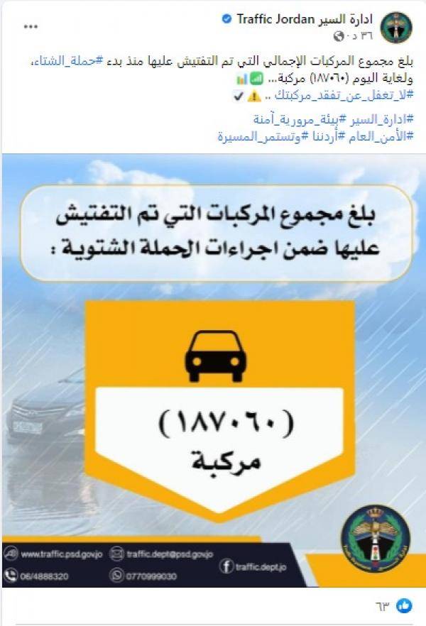 : بلغ مجموع المركبات الإجمالي التي تم التفتيش عليها منذ بدء حملة الشتاء، ولغاية اليوم الخميس 187 الفا و60 مركبة، وفق إدارة السير المركزية.