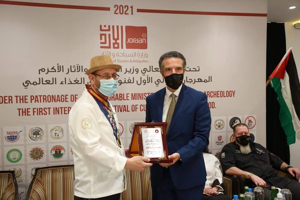 وقدم رئيس الجمعية الفلسطينية لفنون الطهي سامر أبو جمعة للوزير الفايز، درعاً تقديرياً مقدم من الجمعيتين الأردنية والفلسطينية.