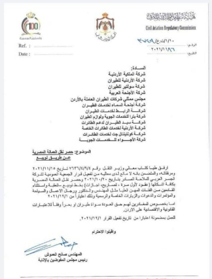 سمح وزير النقل الأردني بتفعيل قرار الجمعية العمومية لشركة الجسر العربي للملاحة ونقل العمالة المصرية حصريا ب "الجسر العربي "اعتبارا من مطلع كانون اول المقبل.