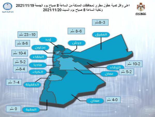 وجاءت محافظة اربد بالمرتبة الأولى كأعلى نسبة هطول مطري حيث بلغت 10 – 20 ملم ، بينما جاءت محافظة العقبة في المرتبة الأخيرة ولم تسجل هطولا للامطار .