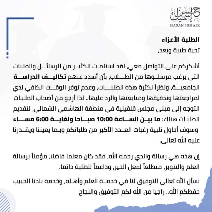 وأكد، أنه سوف يحاول تلبية رغبات العدد الأكبر من طلبات المتقدمين من الطلبة، "وبما يعيننا ويقدرنا عليه الله تعالى”، مضيفا أن "هذه هي رسالة والدي رحمه الله، فقد كان معلما فاضلا، مؤمناً برسالة العلم والتنوير، متطلعاً لفعل الخير، وداعماً للطلبة دائما”.