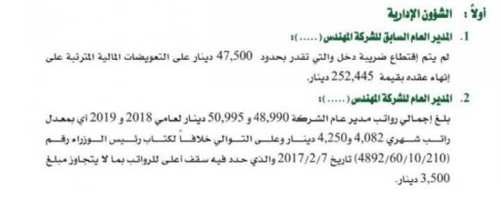 كشف تقرير ديوان المحاسبة 2020 عن تقاضي مدير عام شركة حكومية راتب 4250 دينارا شهريا خلال عام 2019، وراتب 4082 دينارا شهريا خلال عام 2018.