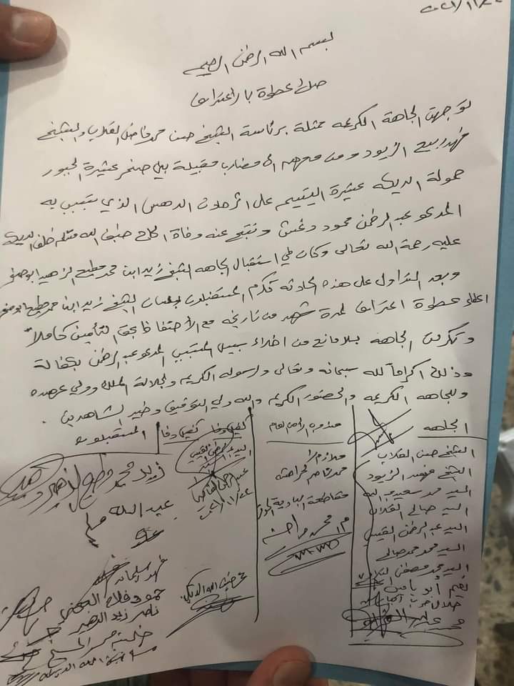 وتكرمت الجاهه بلا مانع من إخلاء سبيل المتسبب المدعو عبدالرحمن بكفالة وذلك إكرامًا لله سبحانه وتعالى ولرسوله الكريم ولجلالة الملك وولي عهده وللجاهه الكريمه والحضور الكريم .
