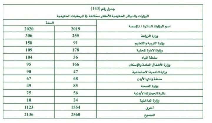 ووفق التقرير كانت وزارة الزراعة هي الأكثر مخالفة بواقع 306 مخالفات، تبعتها وزارة التربية والتعليم بـ 158 مخالفة، والادارة المحلية بـ 109 مخالفات، وسلطة المياه بـ 104 مخالفات.