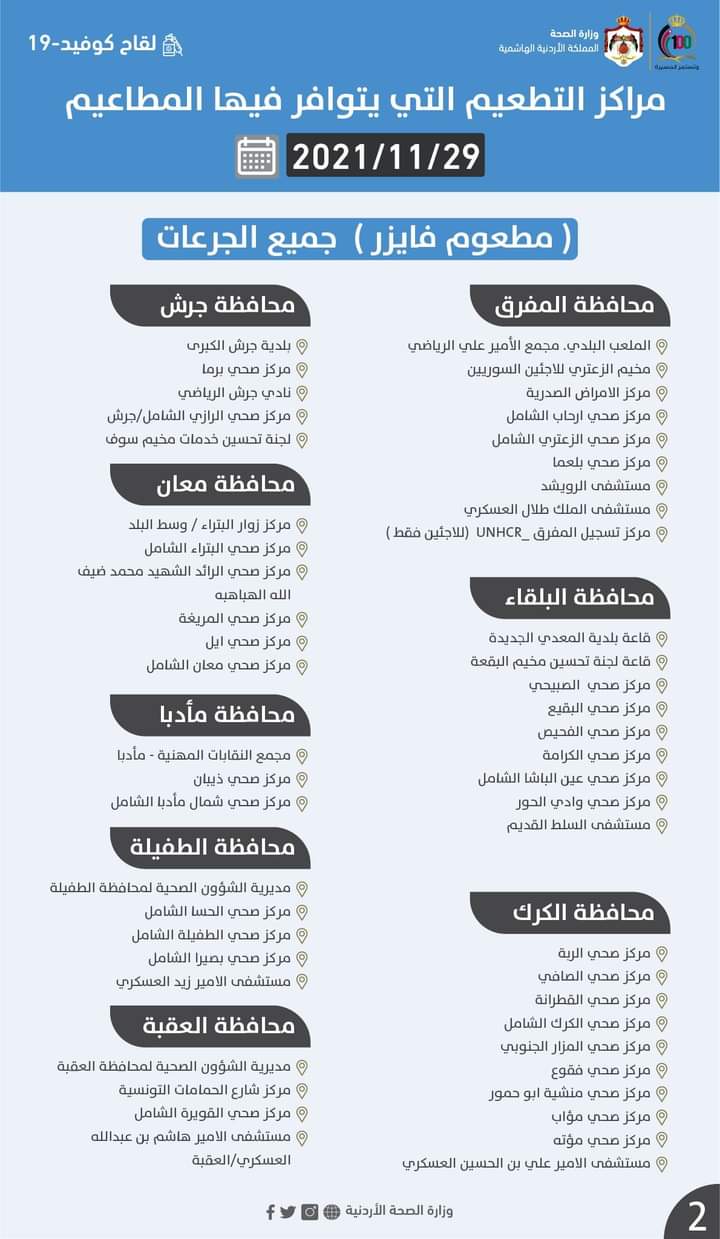 مراكز التطعيم ليوم الاثنين 2021/11/29 التي يتوافر فيها المطاعيم #جميع_الجرعات :