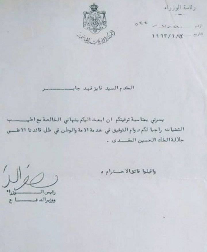 في ذكرى استشهاد المرحوم وصفي التل صديق المرحوم والدي فايز جابر ورفيق عمره. ادعوا لهما بالرحمة و ان يجعل مثواهما الجنّة. -رسالة تهنئة من المرحوم إلى والدي رحمه الله بمناسبة ترفيعه لرتبة مقدّم عام ١٩٦٣.