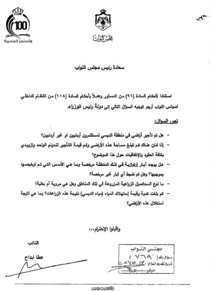 وجه النائب عطا ابداح سؤالا نيابيا، لوزيري الزراعة والمياه والرِّي، بشأن تأجير أراضٍ في منطقة الديسي، لمستثمرين أردنيين وأو غير أردنيين.