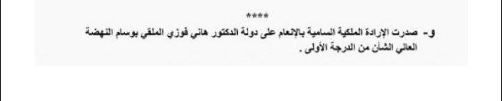 : صدرت الارادة الملكية السامية بالانعام على رئيس الوزراء الأسبق هاني الملقي بوسام النهضة العالي الشأن من الدرجة الأولى وذلك وفق ما نشرته الجريدة الرسمية اليوم الأربعاء.