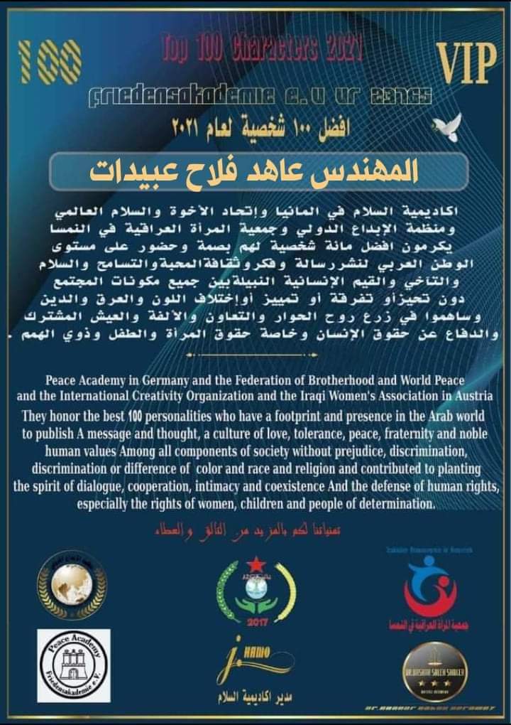 كرمت أكاديمية السلام في ألمانيا واتحاد الأخوة والسلام العالمي ومنظمة الإبداع الدولي وجمعية المرأة العراقية المهندس عاهد عبيدات ضمن أبرز 100 شخصية عالمية لهذا العام 2021 .