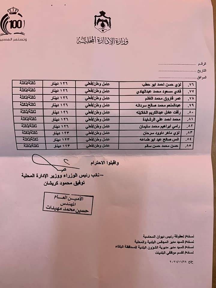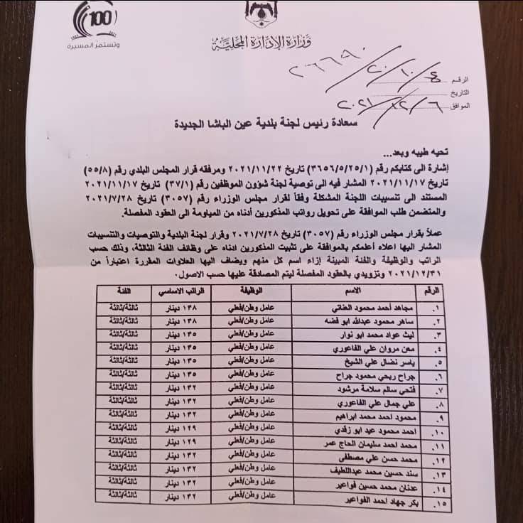 وجاء القرار عملا بقرار مجلس الوزراء وقرار لجنة البلدية والتوصيات والتنسيبات على تثبيت العمال على وظائف الفئة الثالثة اعتبارا من تاريخ 31/12/2021.