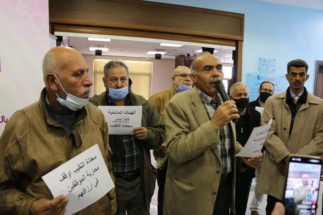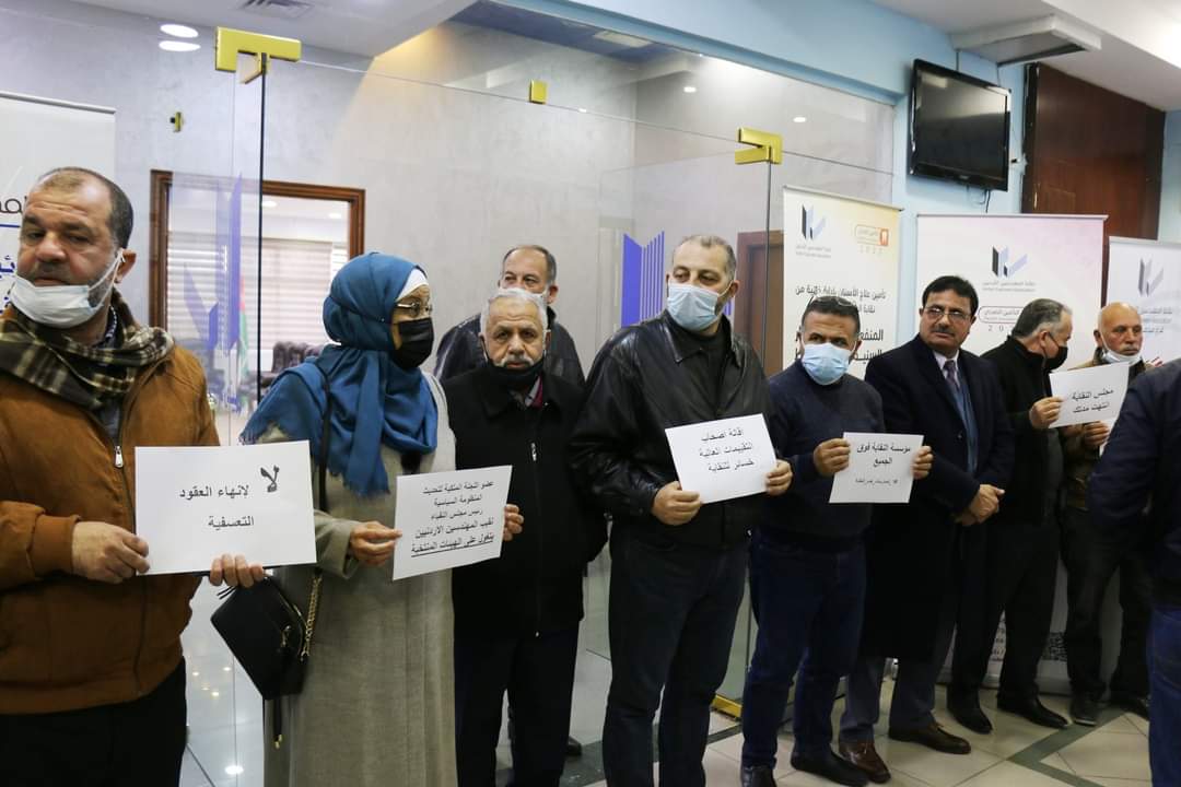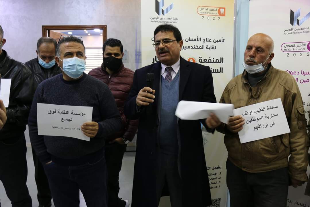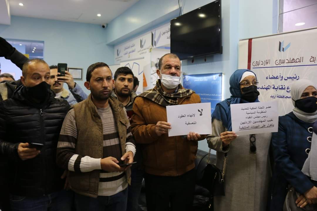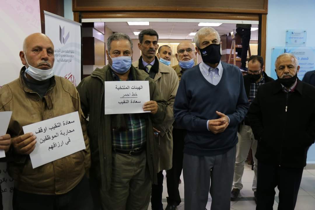 نظمت نقابة المهندسين فرع اربد وقفة احتجاجية في مقر النقابة الكائن بمجمع النقابات بمدينة اربد بمشاركة رئيس فرع النقابة المهندس احمد ملكاوي والهيئة الادارية للنقابة , وذلك احتجاجا وتعبيرا عن رفضهم لقرار انهاء خدمات اثنين من الموظفين في الفرع من قبل مجلس نقابة المهندسين الاردنيين واصفينه بالتعسفي .