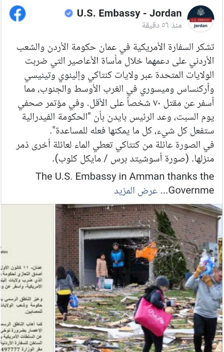 شكرت السفارة الأمريكية في عمّان، الحكومة والشعب الأردني على دعمهما خلال مأساة الأعاصير التي ضربت الولايات المتحدة عبر ولايات كنتاكي وإلينوي وتينيسي وأركنساس وميسوري في الغرب الأوسط والجنوب.