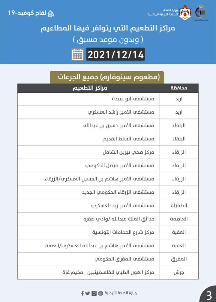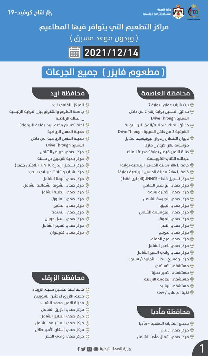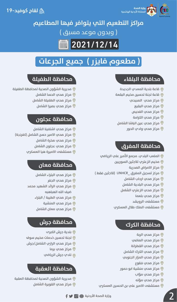 مراكز التطعيم ليوم الثلاثاء 2021/12/14 التي يتوافر فيها المطاعيم ( وبدون موعد مسبق ) #جميع_الجرعات :