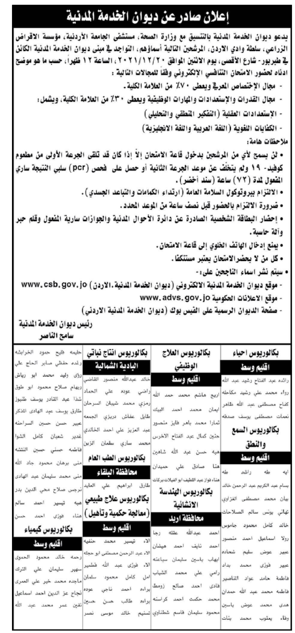 دعا ديوان الخدمة المدنية بالتنسيق مع وزارة الصحة، ومستشفى الجامعة الأردنية، ومؤسسة الإقراض الزراعي، وسلطة وادي الأردن، مرشحين لحضور الامتحان التنافسي.