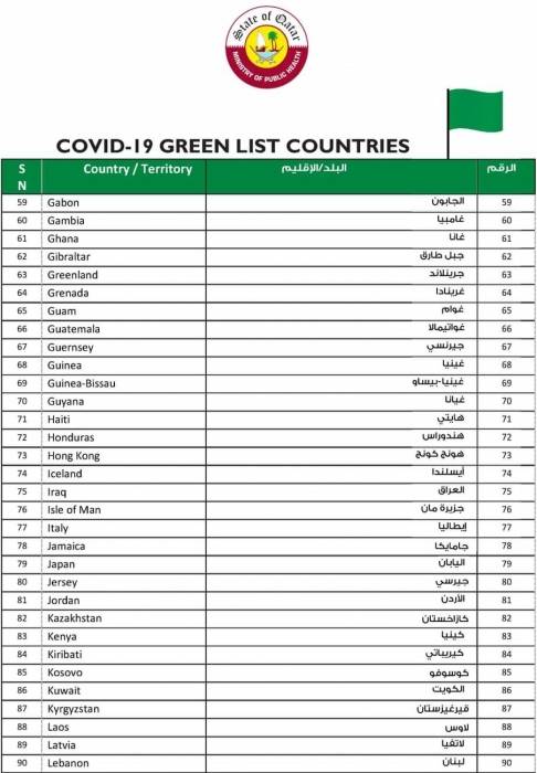 أصدرت دولة قطر قائمة الدول الخضراء، والتي تدخل حيّز التنفيذ الساعة 6 مساء يوم الأحد 19 ديسمبر.