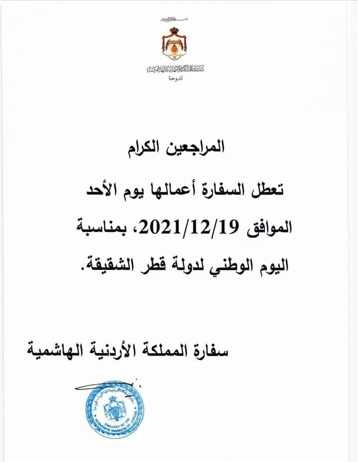 أعلنت السفارة الأردنية في قطر عن إغلاقها لليوم الأحد. وذلك بمناسبة اليوم الوطني لدولة قطر الشقيقة.