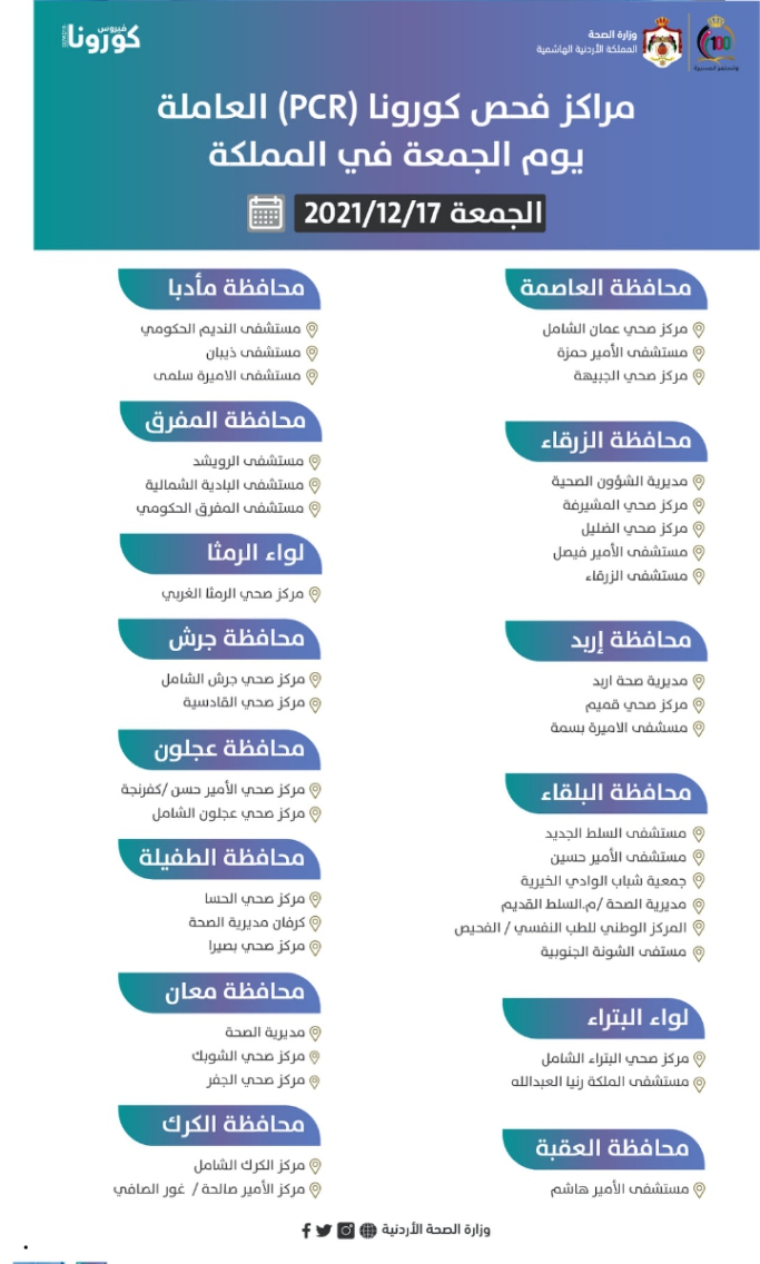 أعلنت وزارة الصحة عن مراكز فحص كورونا (PCR) العاملة يوم الجمعة 2021/12/17 وحسب التالي: