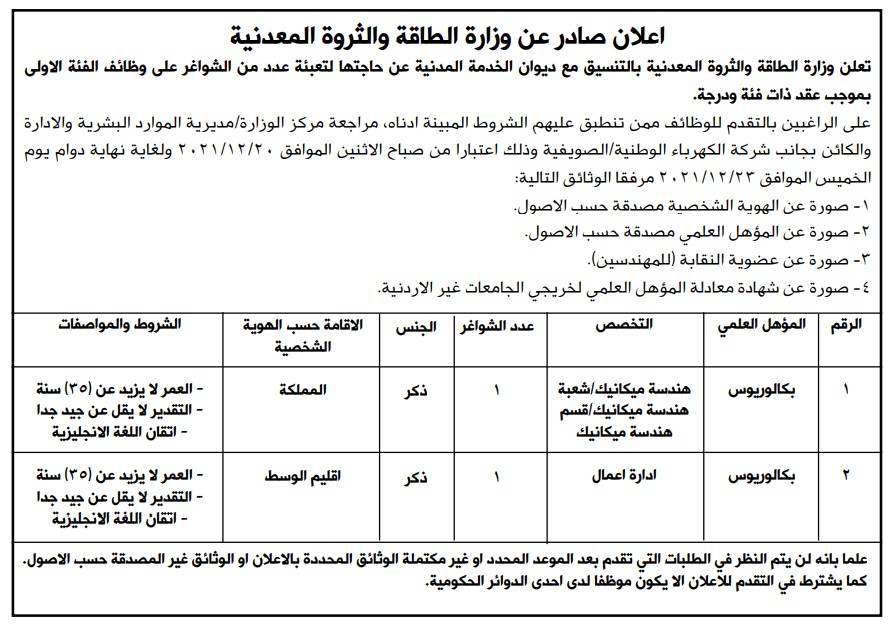 نيروز الإخبارية : أعلنت وزارة الطاقة والثروة المعدنية بالتنسيق مع ديوان الخدمة المدنية، عن حاجتها إلى تعبئة شاغران على وظائف الفئة الأولى، بموجب عقد ذات فئة ودرجة.