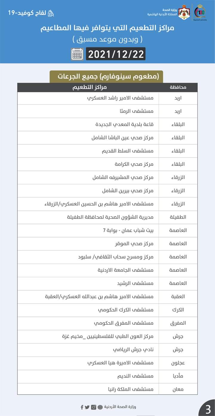 أعلنت وزارة الصحة قائمة أسماء المراكز التي يتوافر فيها مطعوم فيروس كورونا (بدون موعد مسبق) بجميع الجرعات ليوم الأربعاء 2021/12/22.