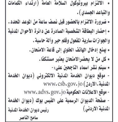 ويعقد ديوان الخدمة المدنية الامتحان التنافسي الالكتروني وفقا للمجالات التالي: أولا مجال الاختصاص الوظيفي ويعطي 70% من العلامة الكلية، ثانيا في مجال القدرات والاستعدادات والمهارات الوظيفية ويعطي 30 % من العلامة الكلية.