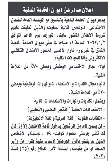 نيروز الإخبارية : دعا ديوان الخدمة المدنية بالتنسيق مع المؤسسة العامة للضمان الاجتماعي، مرشحين لحضور الامتحان التنافسي.