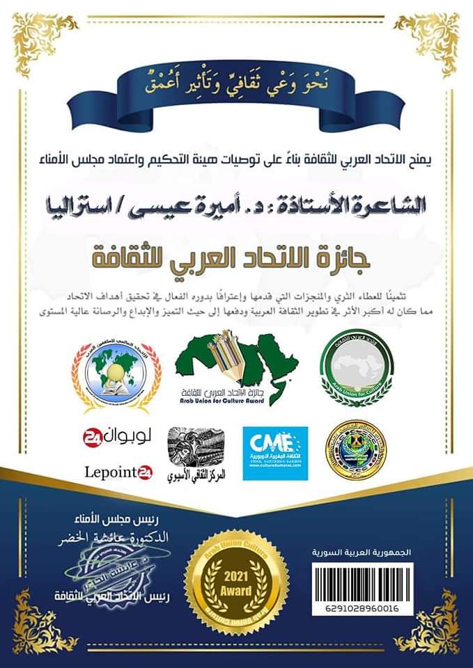 وقالت الجمعية الأسترالية الاردنية ، تبارك الجمعية الأردنية الأسترالية ممثلة برئيسها المهندس  محمد القاضي للدكتورة أميرة عيسى رئيسة المنتدى الثقافي الاسترالي العربي لحصولها على جائزة الاتحاد العربي .