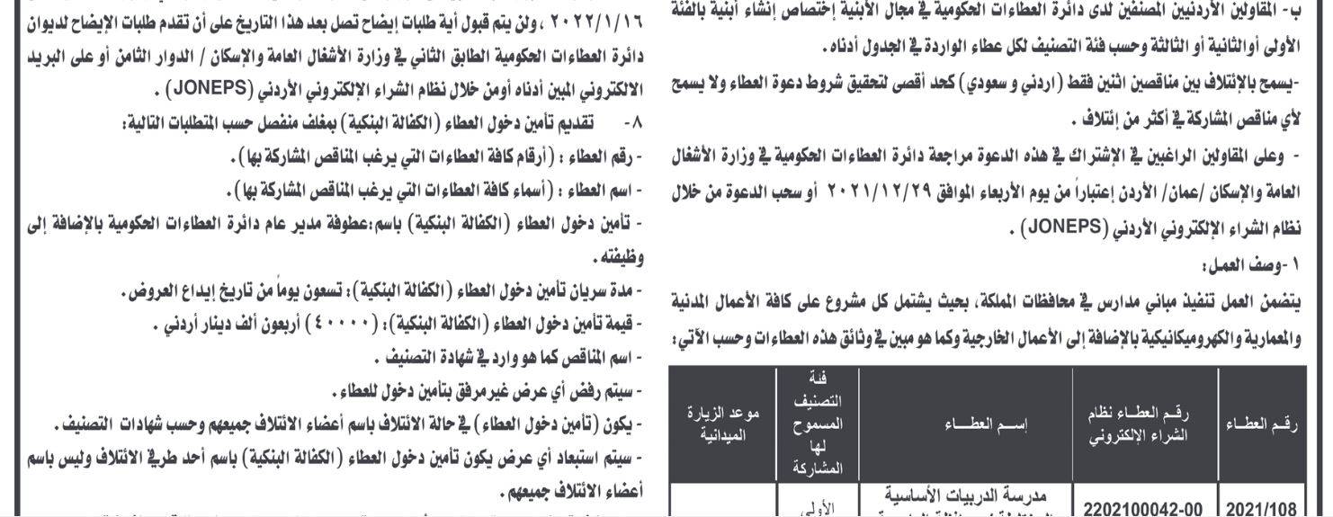 وحسب الإعلان الصادر عن دائرة العطاءات فإن المقاولين الأردنيين والسعوديين مدعوين للإشتراك في العطاء كما يلي: