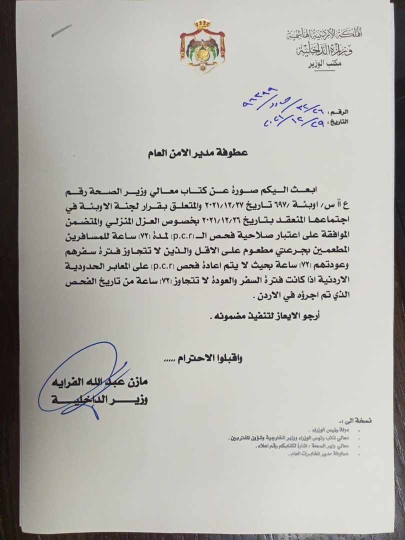 وتضمن الكتاب الموافقة على اعتبار صلاحية فحص الـPCR لمدة 72 ساعة للمسافرين المطعمين بجرعتي مطعوم على الأقل والذين لا تتجاوز فترة سفرهم وعودتهم 72 ساعة، بحيث لا يتم إعادة فحص الـPCR على المعابر الحدودية الأردنية إذا كانت فترة السفر والعودة لا تتجاوز 72 ساعة من تاريخ الفحص الذي تم إجراؤه في الأردن.