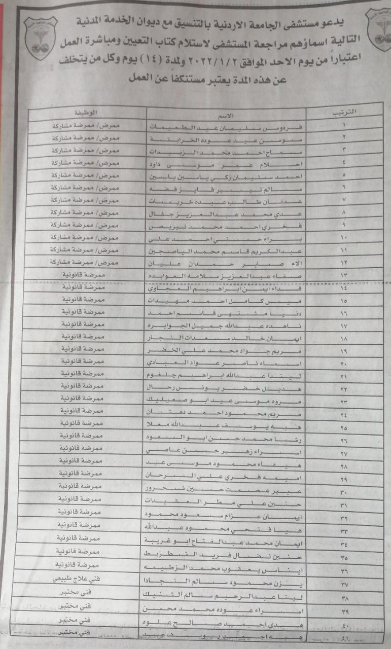 دعا مستشفى الجامعة الأردنية بالتنسيق مع ديوان الخدمة المدنية اسماء مرشحين للتعيين لاستلام كتاب التعيين و مباشرة العمل اعتبارًا من يوم الاحد الموافق 2022/1/2 ولمدة 14 يوم وفقًا للاعلان الذي اطلعت عليه نيروز .