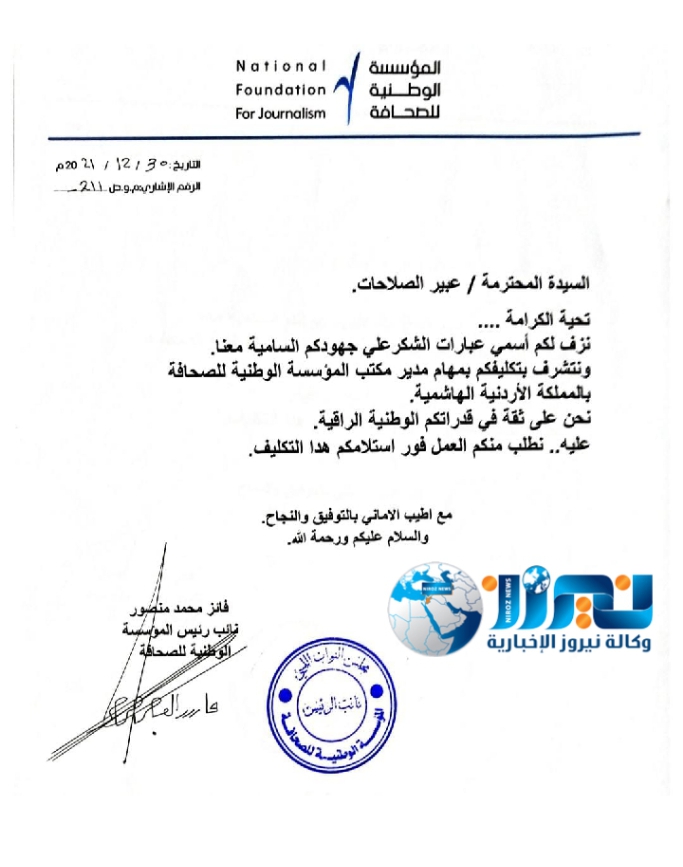 تكليف الصلاحات بمهام مديرًا لمكتب المؤسسة الوطنية للصحافة ...وثيقة