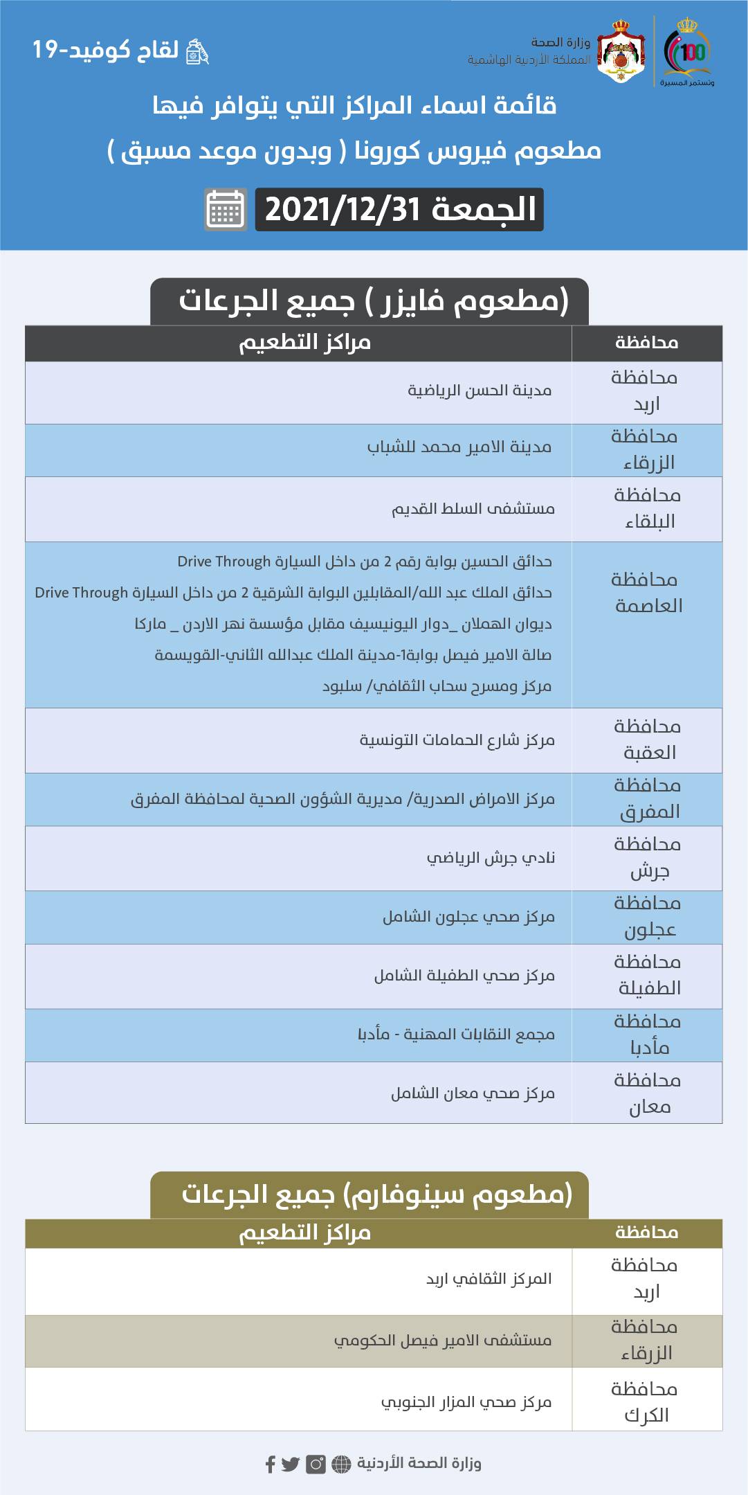 أعلنت وزارة الصحة عن قائمة أسماء المراكز التي يتوافر فيها مطعوم فيروس كورونا (بدون موعد مسبق) لجميع جرعات فايزر وسينوفارم خلال يوم الجمعة.