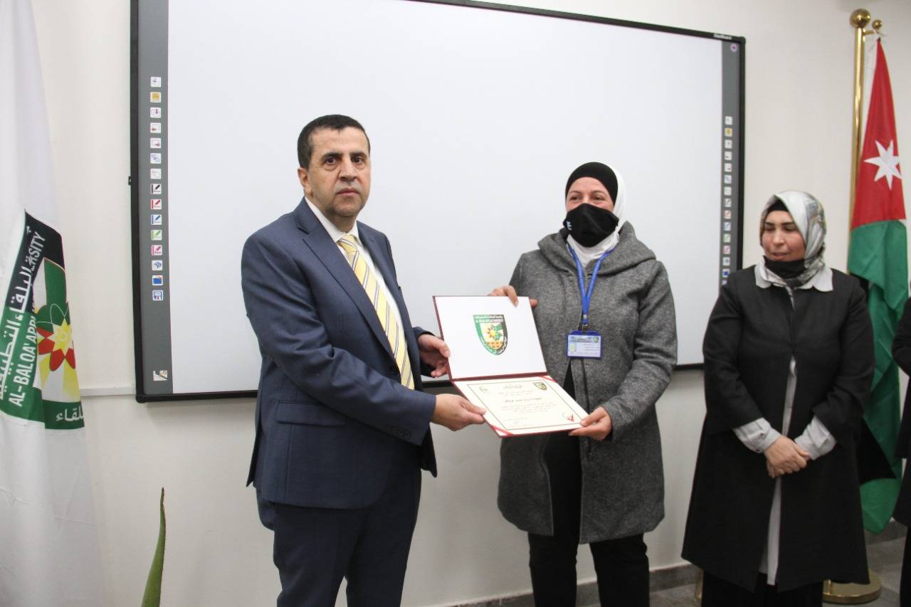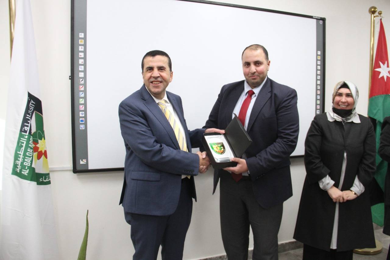 وعلى هامش اللقاء كرم الدكتور العجلوني الدكتوره شرف عمر من كلية الزراعه تقديرا لها على ابحاثها المتميزة، والموظفين في الكلية المهندسة روان ابو طالب والسيد ثامر ابو مان لتميزههم في العمل في الكلية.
