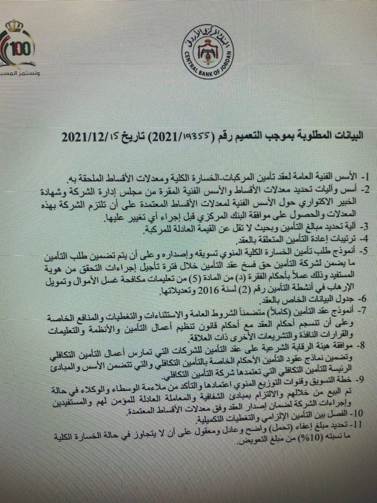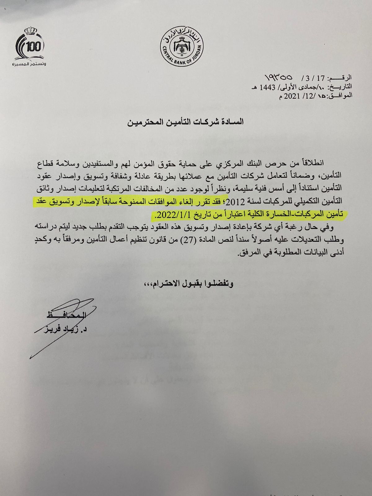 انطلاقاً من حرص البنك المركزي على حماية حقوق المؤمن لهم والمستفيدين وسلامة قطاع التأمين، وضماناً لتعامل شركات التأمين مع عملائها بطريقة عادلة وشفافة وتسويق وإصدار عقود التأمين استناداً إلى أسس فنية سليمة، ونظراً لوجود عدد من المخالفات المرتكبة لتعليمات إصدار وثائق التأمين التكميلي للمركبات لسنة 2012 فقد تقرر إلغاء الموافقات الممنوحة سابقاً لإصدار وتسويق عقد تأمين المركبات - الخسارة الكلية إعتباراً من تاريخ 1/1/2022.