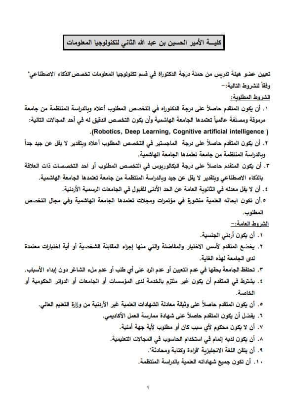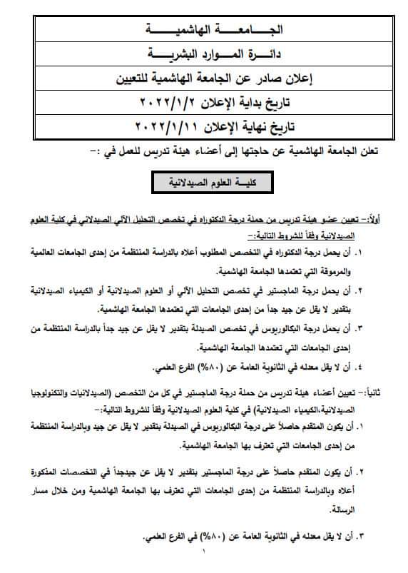 تعلن الجامعة الهاشمية عن حاجتها لتعيين أعضاء هيئة تدريس في كلية العلوم الصيدلانية، وعضو هيئة تدريس في كلية الأمير الحسين بن عبدالله الثاني لتكنولوجيا المعلومات، وذلك اعتباراً من 2-1-2022 ولغاية 11-1-2022
