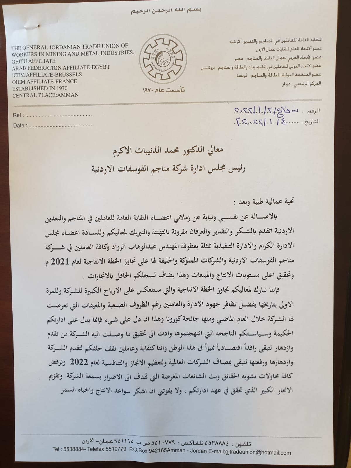 واعربت في كتاب شكر وجهته اليوم، لرئيس مجلس ادارة الشركة الدكتور محمد الذنيبات، ومجلس الادارة، والادارة التنفيذية للشركة، عن تقديرها لتجاوز شركة مناجم الفوسفات الأردنية والشركات المملوكة والحليفة للخطة الانتاجية لعام 2021، وتحقيقها أعلى مستويات للانتاج والمبيعات.