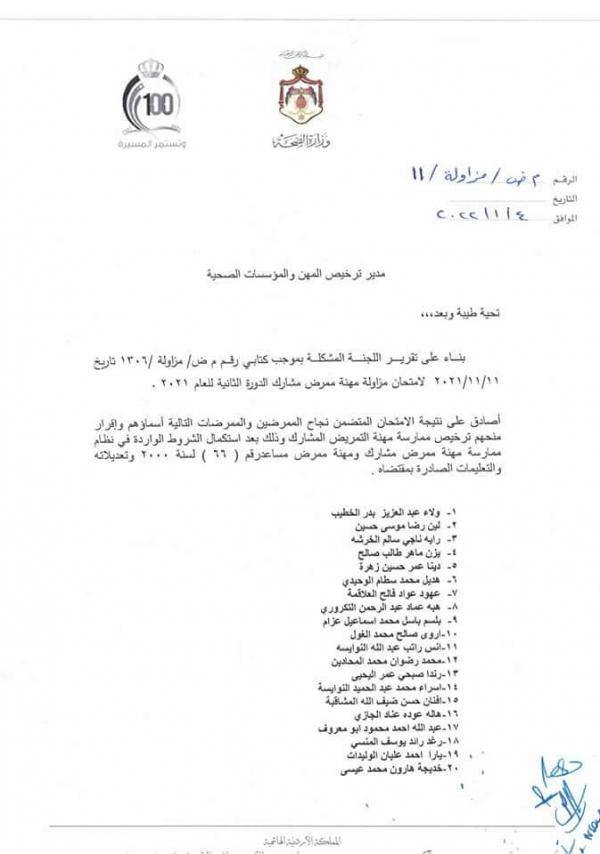 نيروز الإخبارية : صادق وزير الصحة الدكتور فراس الهواري على تقرير لجنة امتحان مزاولة مهنة ممرض مشارك الناجحين في الدورة الثانية للعام 2021 وعددهم 500 ممرض وممرضة.