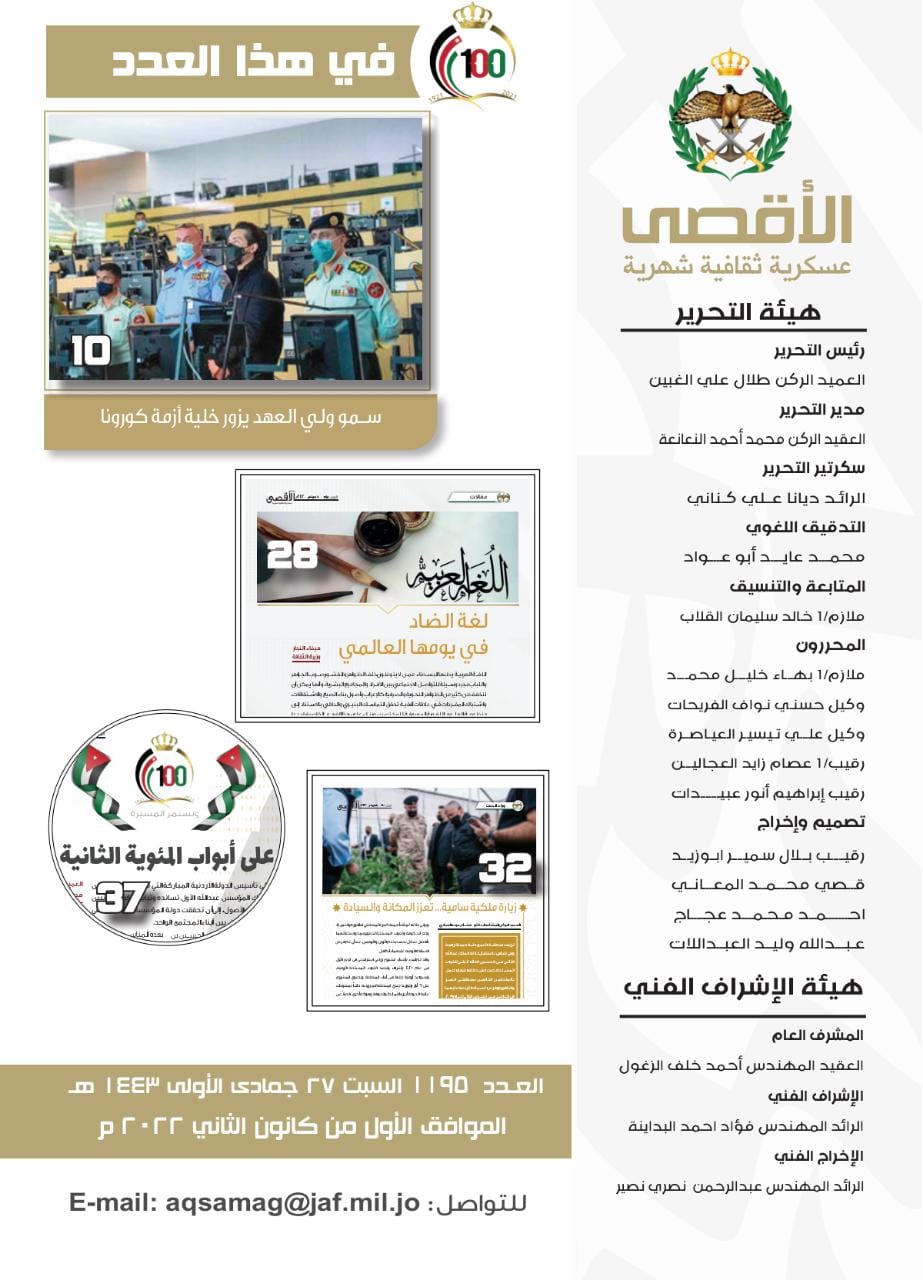 أصدرت مديرية التوجيه المعنوي في القيادة العامة للقوات المسلحة الأردنية  الجيش العربي عددًا جديدًا من مجلة الأقصى الشهرية الذي يرأس تحريرها العميد الركن طلال الغبين والذي   تضمن جملة من الموضوعات العسكرية والثقافية المتنوعة .