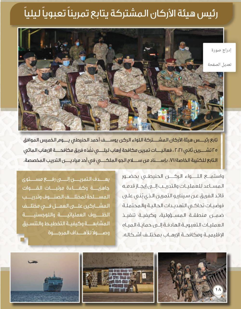 وكما تحدث العدد عن متابعة رئيس هيئة الأركان المشتركة اللواء الركن يوسف احمد الحنيطي  لتمرينًا تعبويًا ليليًا .