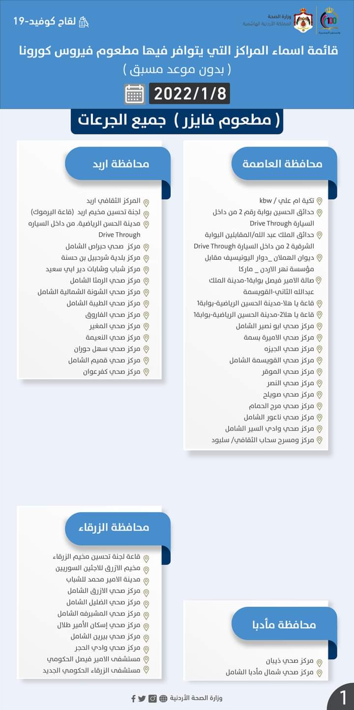 أعلنت وزارة الصحة، عن أسماء المراكز التي يتوفر فيها مطعوم فيروس كورونا بدون موعد مسبق لجميع الجرعات ليوم السبت.