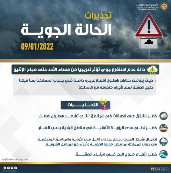 نيروز الإخبارية : أصدر المركز الوطني للأمن وإدارة الازمات تحذيرات من حالة عدم الاستقرار الجوي التي سيبدأ تأثيرها تدريجيا على المملكة، اعتبارا من مساء اليوم الأحد 9 كانون الثاني وحتى صباح يوم غد الاثنين.