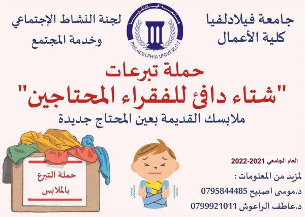 نيروز الإخبارية : اختتمت لجنة النشاط الاجتماعي وخدمة المجتمع في كلية الاعمال بجامعة فيلادلفيا حملة التبرع بالملابس تحت عنوان حملة شتاء دافئ للعام الدراسي 2021-2022
