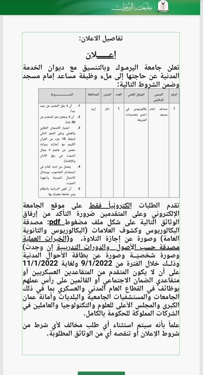 أعلنت جامعة اليرموك وبالتنسيق مع ديوان الخدمة المدنية عن حاجتها إلى ملء وظيفة مساعد إمام مسجد وذلك وفقًا للشروط المرفقة :