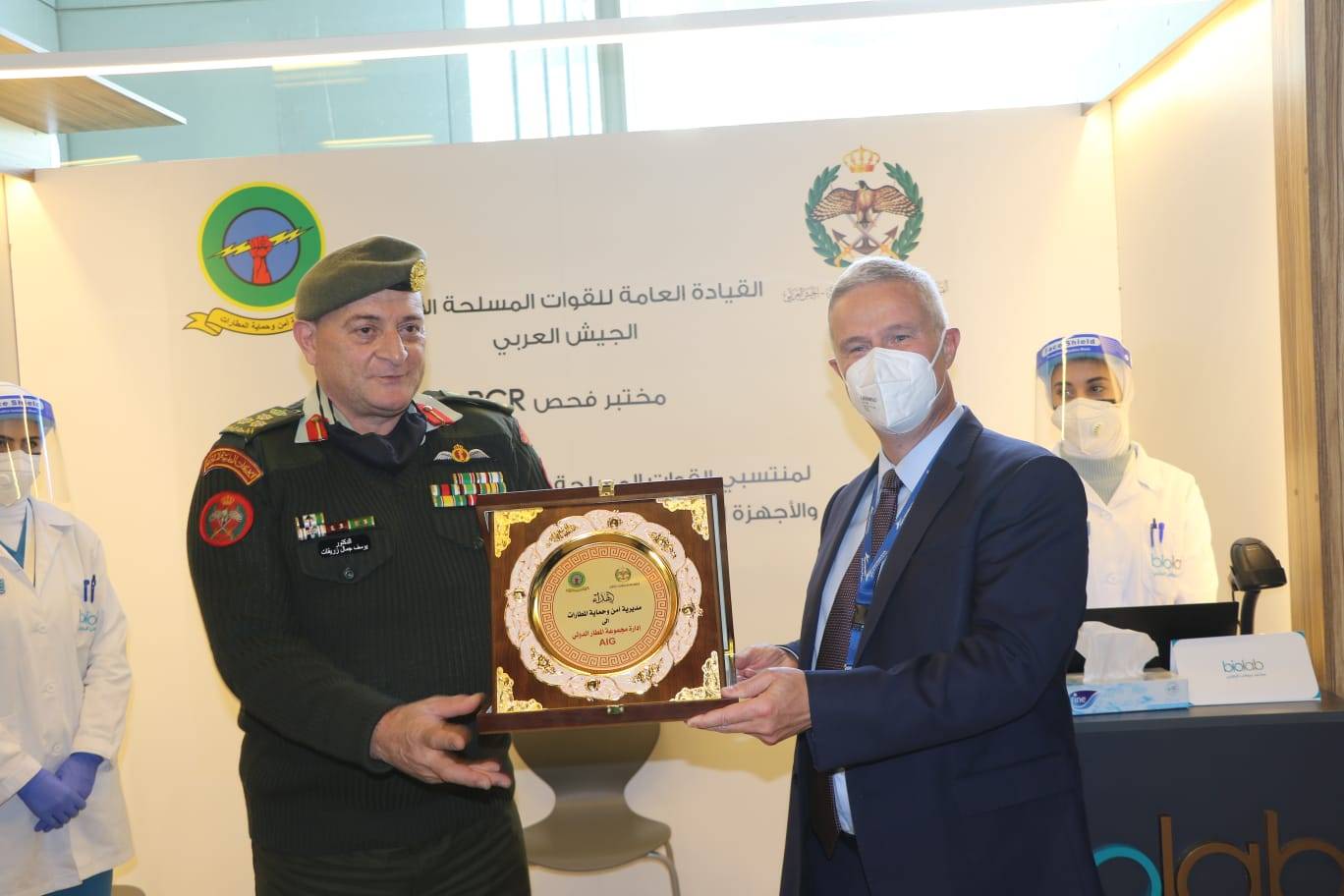 وفي نهاية الافتتاح الذي حضره عدد من ضباط القوات المسلحة الأردنية والأجهزة الأمنية، كرم العميد الطبيب زريقات إدارة مجموعة المطار الدولي (AIG) ومدير عام مختبرات بيولاب الدكتور "عميد” عبد النور.