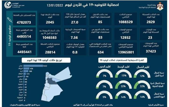 وأضاف، أن نسبة إشغال أسرّة العزل في إقليم الوسط بلغت 15 بالمئة، في حين وصلت نسبة إشغال أسرّة العناية الحثيثة في الإقليم ذاته إلى 32 بالمئة، ونسبة إشغال أجهزة التنفس الاصطناعي إلى 14 بالمئة.