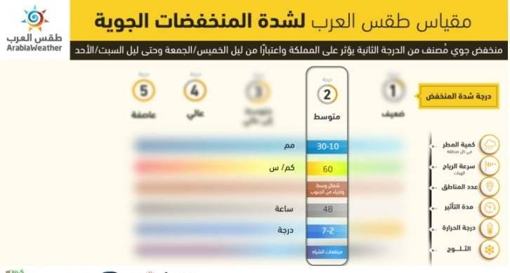 قال موقع طقس العرب إن الأردن يتأثر اعتبارا من ليل الخميس/ الجمعة بمنخفض جوي تم تصنيفه على أنه من الدرجة الثانية وهي درجة المنخفض الجوي الاعتيادي بحسب مقياس طقس العرب لشدة المنخفضات الجوية، حيث يحدث تغير على الأجواء مع هذا التغير في الأنظمة الجوية.