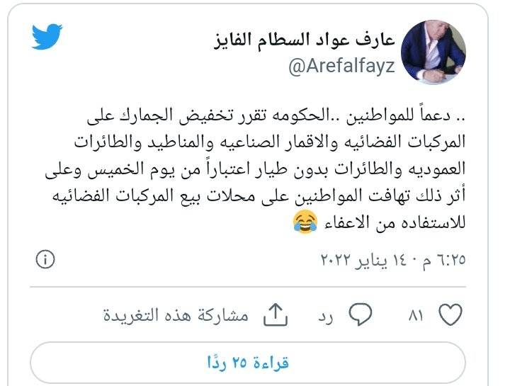 الصحفي نضال سلامة كتب: "الحكومة تعفي المركبات الفضائية من الجمارك .. هسا بسرعة بشتري وحدة واصفها ع باب الدار”.