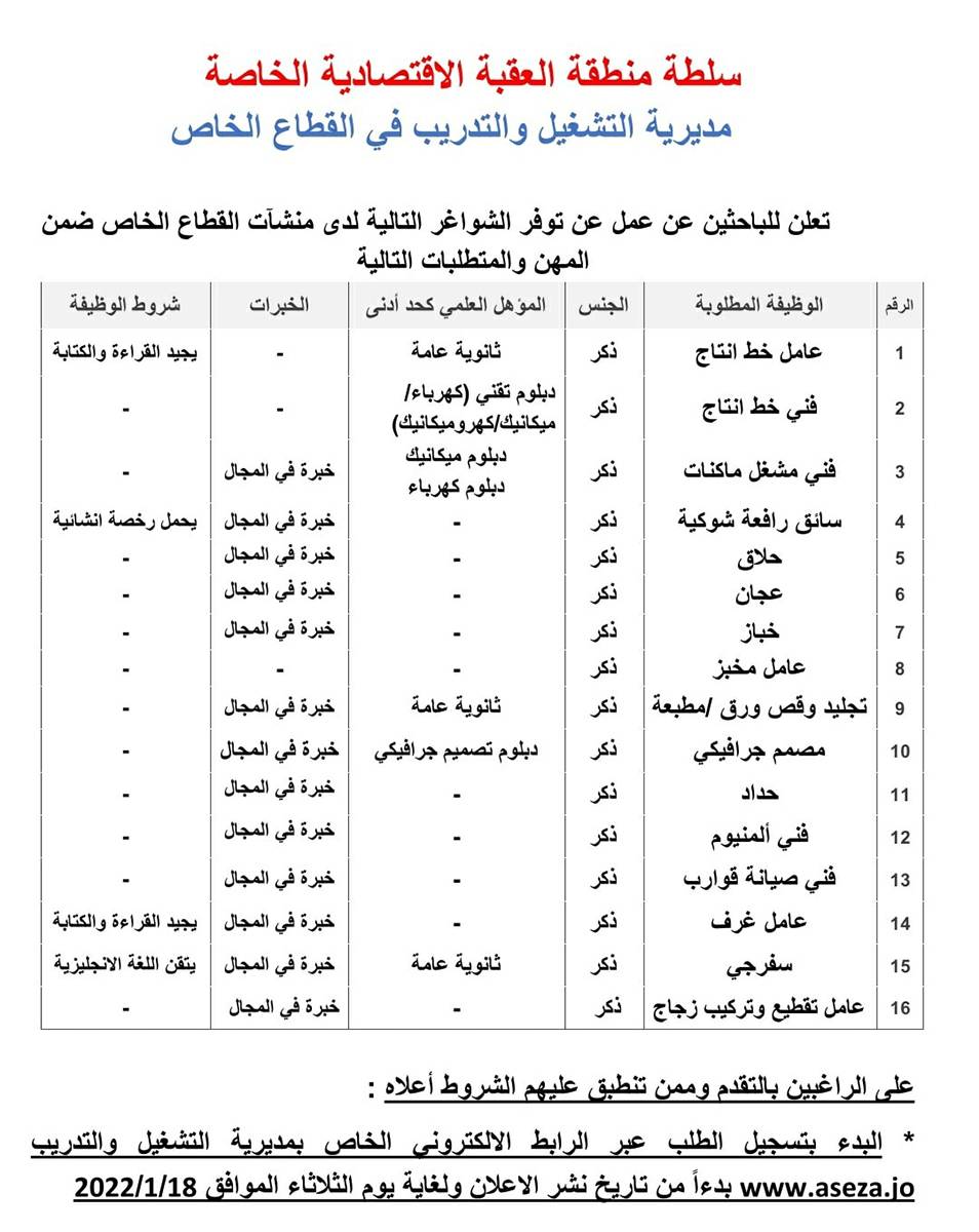 اعلان صادر عن سلطة منطقة العقبة الاقتصادية الخاصة من خلال مديرية التشغيل والتدريب في القطاع الخاص للباحثين عن فرص عمل