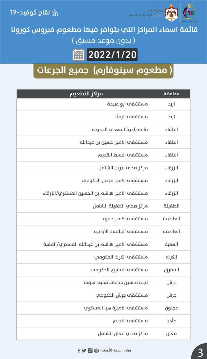 أما الجرعة المعززة الثالثة من مطعوم كوفيد – 19 فتعطى للأشخاص الذين مضى على تلقيهم للجرعة الثانية (6) شهور فأكثر، وبدون موعد مسبق. وبينت الوزارة ان الفئات التي اعتمدتها والتي يسمح تلقيها الجرعة الثالثة على النحو الاتي : الاشخاص من الفئة العمرية (60) سنة فما فوق، الكوادر الصحية، الاشخاص الذين يعانون من امراض نقص المناعة، الاشخاص الذين يعانون من الامراض المزمنة، مثل امراض القلب والضغط والسكري وغيرها من الامراض المزمنة، الفئات ذات الاختطار العالي للاصابة بالمرض من حيث المهنة او مكان العمل او الصفات والامراض الوراثية، وتاليا من الرابط: bit.ly/3nykQap. ولفتت إلى مراكز إعطاء الجرعة المعززة من "فايزر” للمواطنين والمقيمين والعاملين في الخارج الذين تلقوا جرعتي مطعوم سينوفارم لغايات دخول بعض الدول، من خلال الرابط: bit.ly/2ZxqP7x، داعية الراغبين منهم إلى اصطحاب الوثائق الثبوتية (الإقامة، عقد عمل) بالإضافة إلى الهوية الشخصية للأردنيين، وجواز سفر لغير الأردنيين.