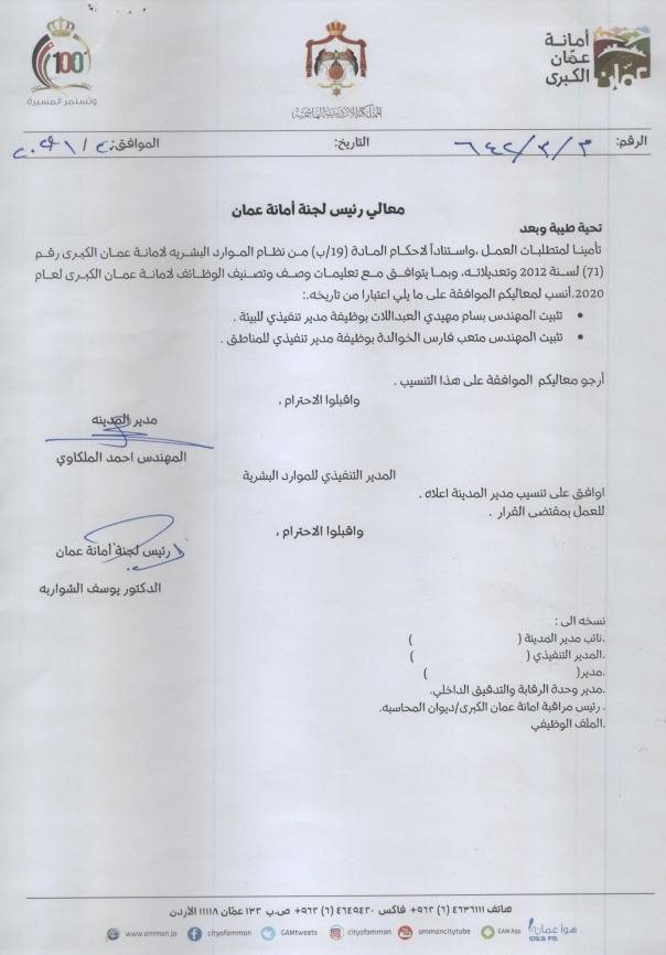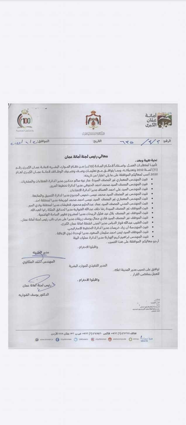 : قرر رئيس لجنة أمانة عمان الدكتور يوسف الشواربة تثبيت عدد من الموظفين التالية أسماؤهم: