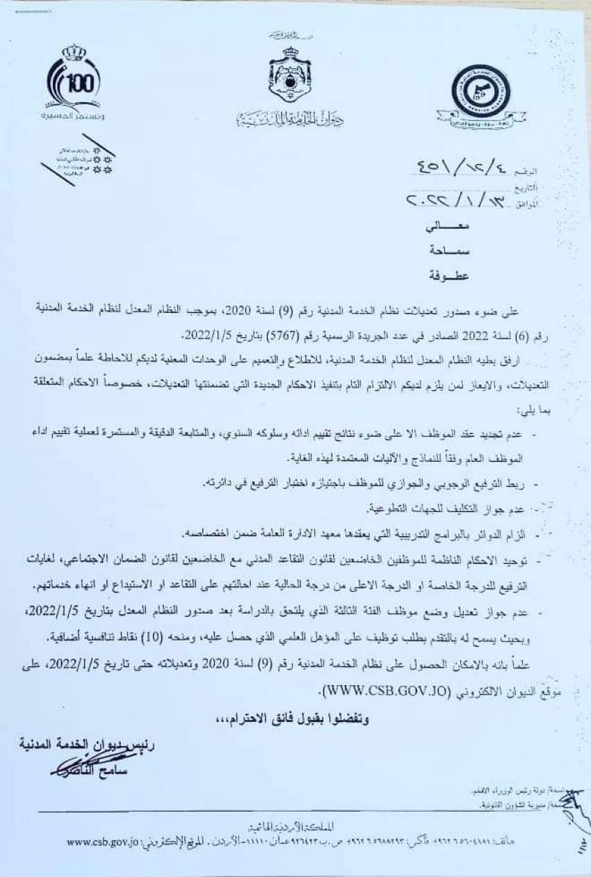 وشدد على عدم جواز تعديل وضع موظف الفئة الثالثة الذي يلتحق بالدراسة بعد صدور النظام المعدل بتاريخ 5/1/2022 وبحيث يسمح له بالتقدم بطلب توظيف على المؤهل العلمي الذي حصل عليه ومنحه 10 نقاط تنافسية اضافية.